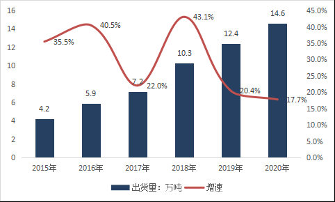 根據(jù)《中國銅箔行業(yè)發(fā)展白皮書(2021年)》數(shù)據(jù)顯示,2020年,中國鋰電銅箔出貨量達到14.6萬噸,同比增長17.7%。2015-2020年鋰電銅箔出貨量年均復合增速高達28.3%。