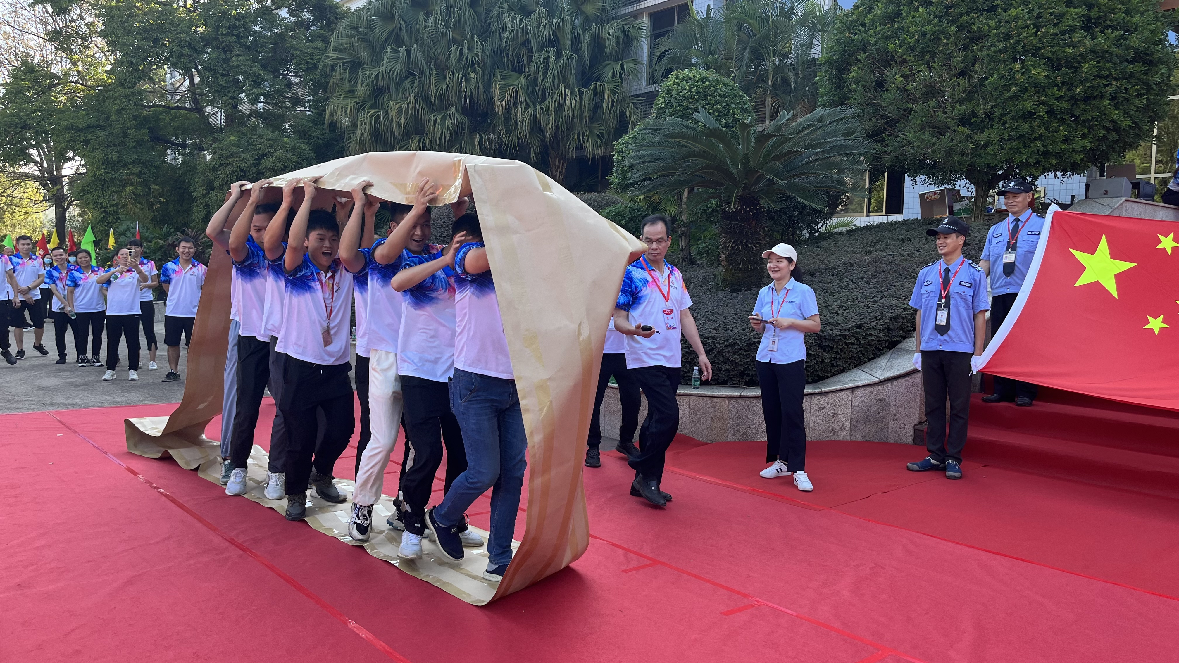 步伐整齊,精神抖擻,國旗護(hù)衛(wèi)隊(duì)邁著堅(jiān)定的步伐,護(hù)送著鮮艷的國旗入場,雄姿英發(fā),氣宇軒昂。司旗護(hù)衛(wèi)隊(duì)手握著公司旗幟,迎著朝陽,大步前進(jìn)。