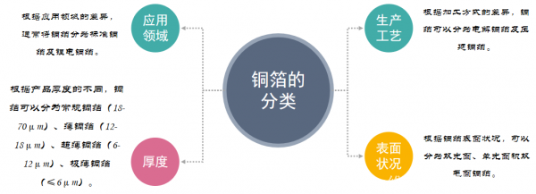 根據(jù)銅箔厚度的差異還可以將銅箔分為常規(guī)銅箔、薄銅箔、超薄銅箔、極薄銅箔。常規(guī)銅箔及薄銅箔主要應用于PCB領域,超薄銅箔、極薄銅箔主要用于鋰電池領域;此外,根據(jù)銅箔表面的狀況還可以將銅箔分為雙光面、單光面、雙毛面銅箔。