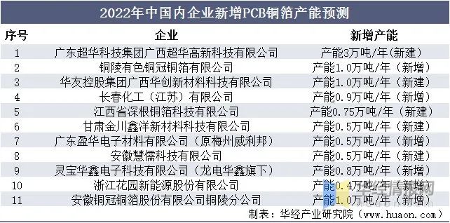 2022年中國內(nèi)企業(yè)新增PCB銅箔產(chǎn)能的預(yù)測